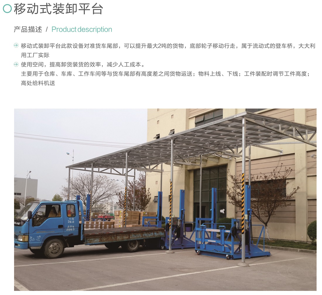 移動式裝卸平臺此款設(shè)備對準(zhǔn)貨車尾部,可以提升最大2噸的貨物,底部輪子移動行走,屬于流動式的登車橋,大大利用工廠實際使用空間,提高卸貨裝貨的效率,減少人工成本。